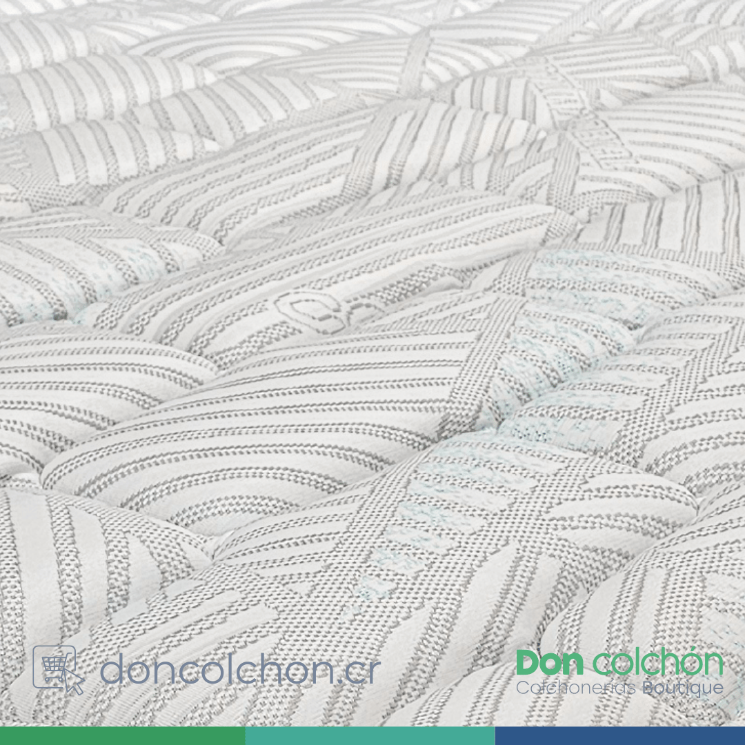 Colchón de tela fría con sistema de resortes reforzado, pillow top con látex natural y tratamiento antibacterial.